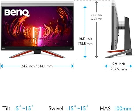 - ابعاد با پایه: 409.6 – 539.6×614.1×216.7 میلیمتر، وزن: 6.2 کیلوگرم.